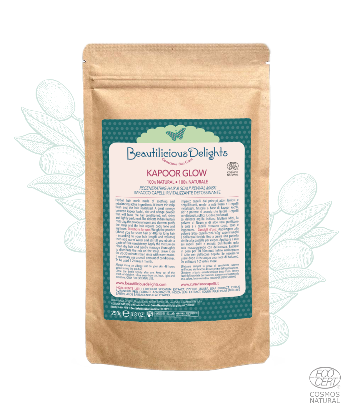 Dalle proprietà astringenti e seboregolatrici, il mix Kapoor Glow svolge un'attività detox delicata sulla cute e dona lucentezza ai capelli senza appesantirli.