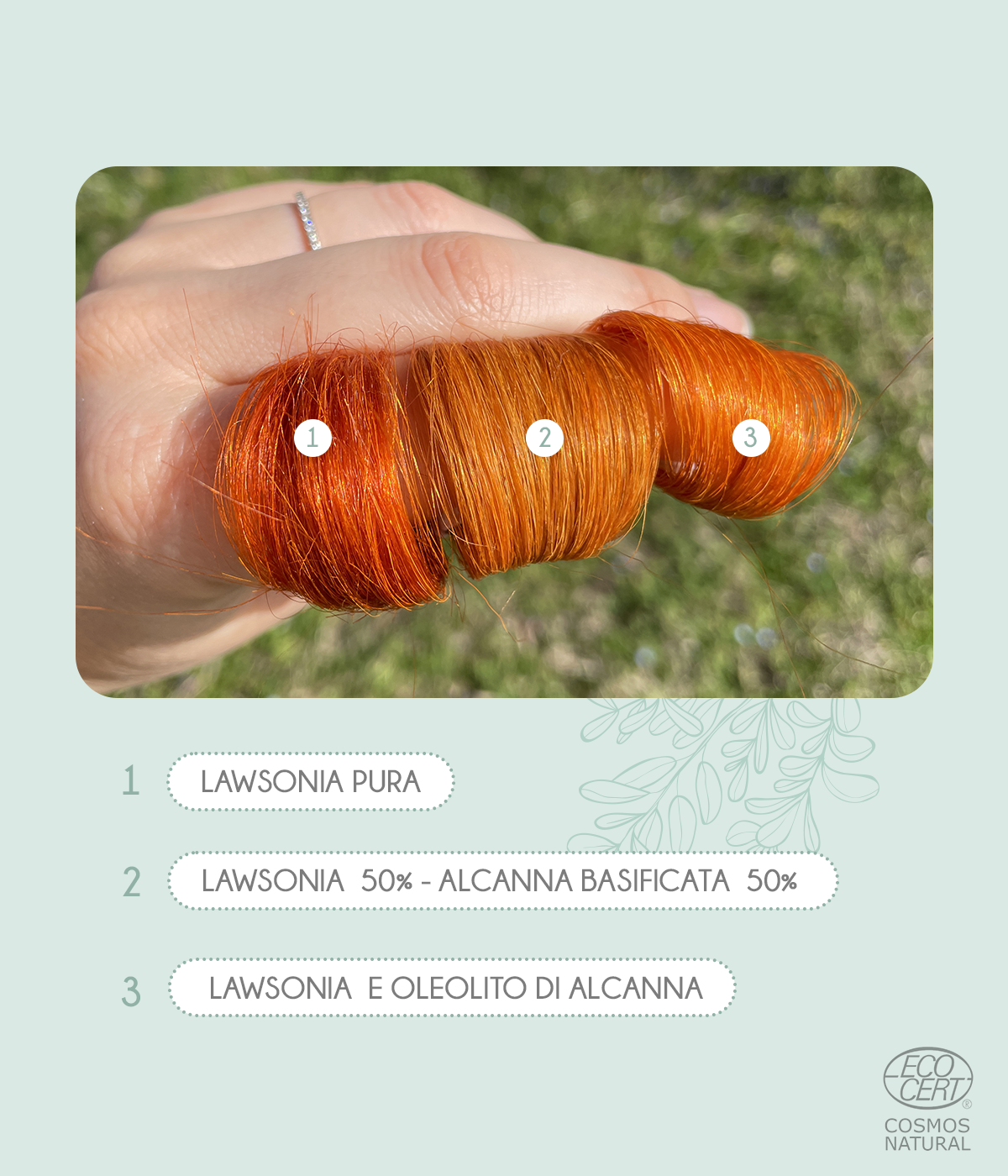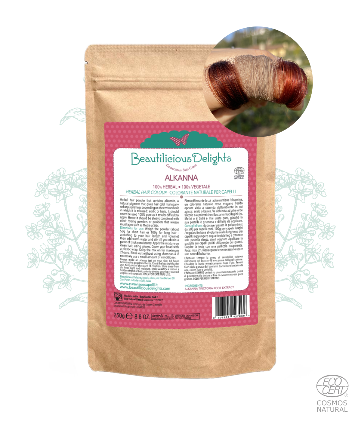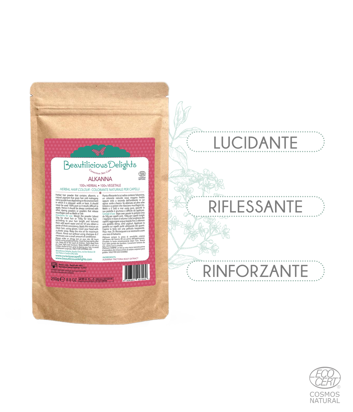 A differenza delle tinte chimiche che modificano irrimediabilmente la struttura dei capelli penetrandone il fusto e rendendoli ruvidi e opachi, il pigmento riflessante dell'alkanna unito ai pigmenti coloranti delle altre erbe tintorie ti permette di creare un colore esclusivamente tuo, dai riflessi unici ed eccezionali.