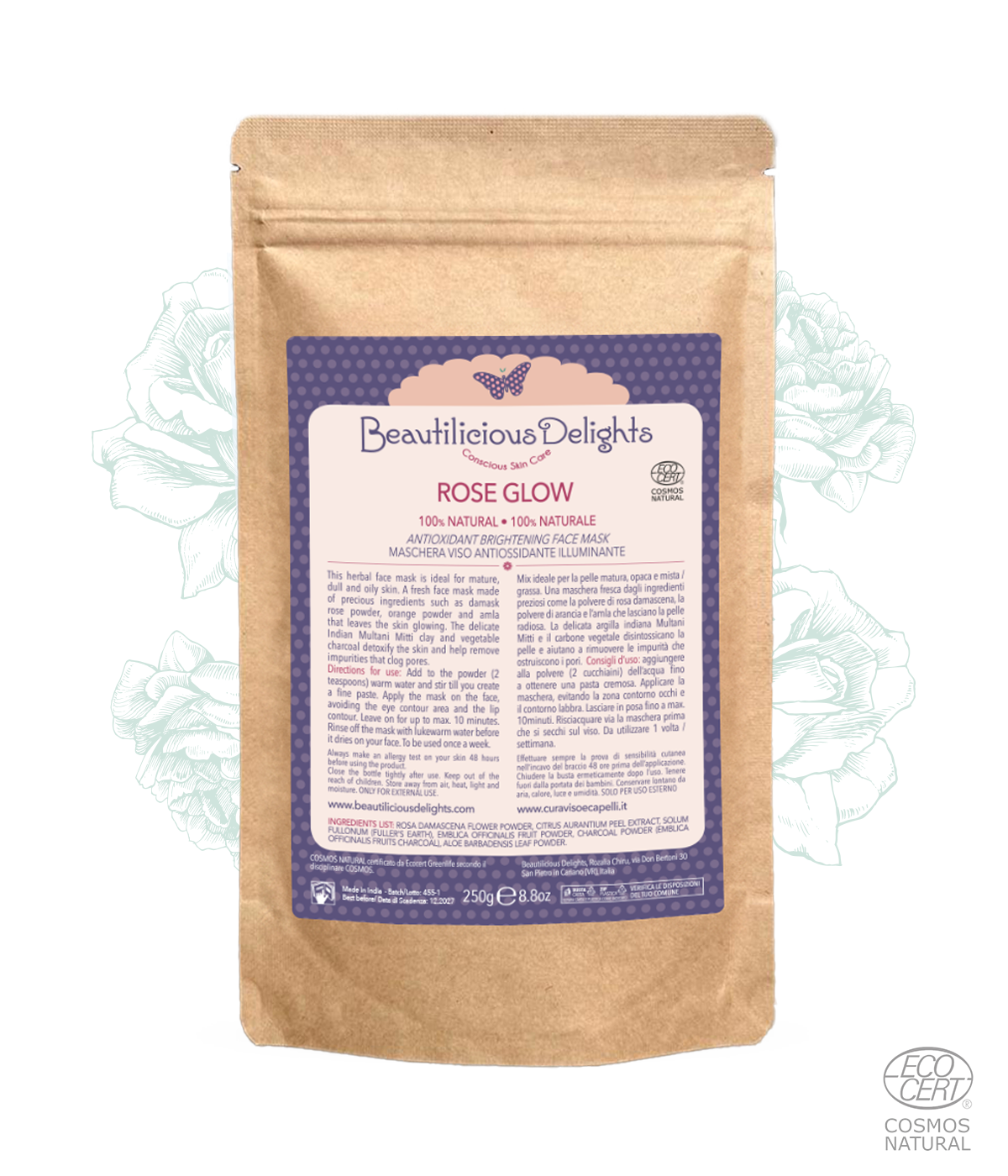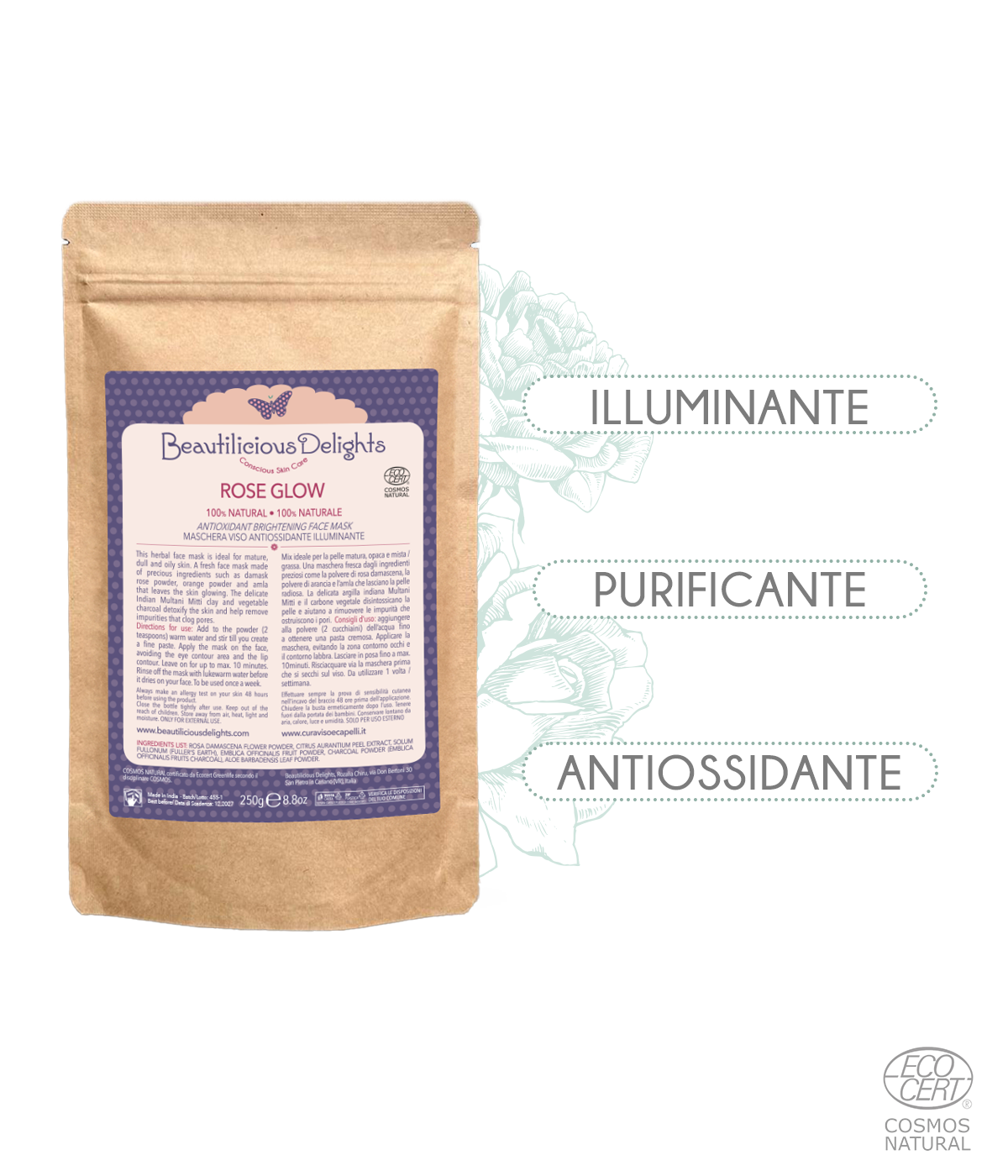 With an astringent and tonic action, the Rose Glow face mask cleanses the skin deeply, it unclogs the pores and it exfoliates the skin by removing the dead cells, it leaves the skin refreshed, with a bright and uniform finish.